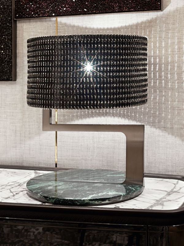 Açıklama: Parlak siyah lake tahtaya yerleştirilmiş paslanmaz çelikten yapılma ve mermer taban, E27 max 60W ampul, dokuma kumaşta abajur veya beyaz iç yüzeye sahip siyah saten yapı. Satined metal terbiye seçiminde mevcut metal parçalar.