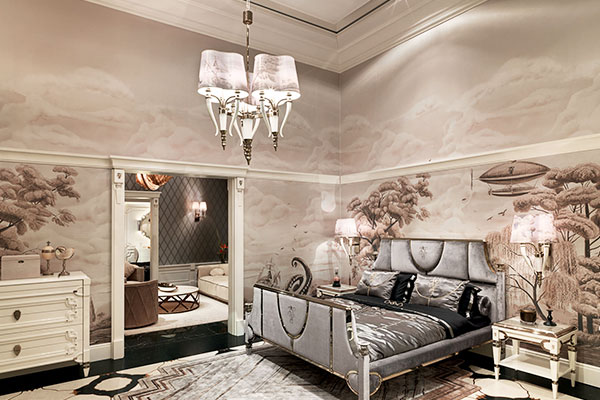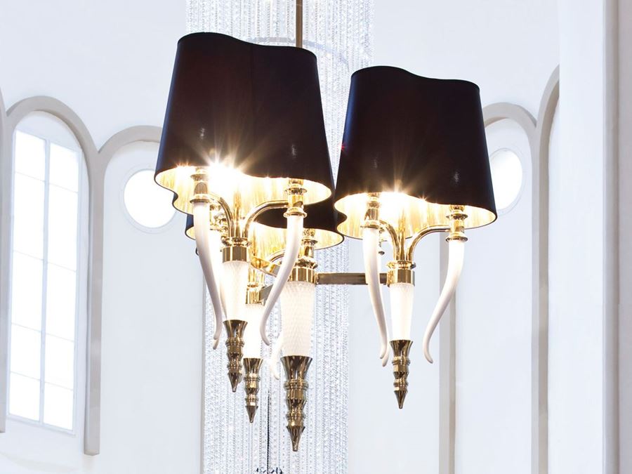 Altın iç dekorasyona sahip siyah kumaştan abajur. Tüm versiyonlar için ihtiyaç duyulan ampuller E27 max 60 W: Avize – 9 ampullerdir. Ağırlık 40 kg. “Denizdeki Maceralar” ve “Çiçekler ve Kuzgunlar” grafikli renklerinde de mevcuttur.