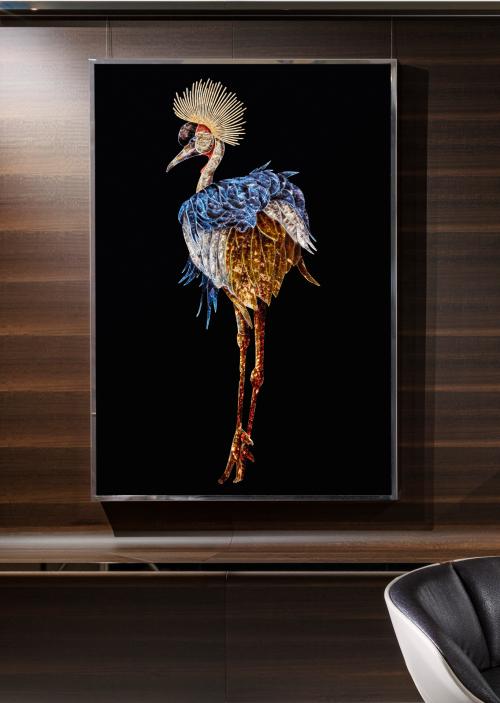 Açıklama: 110x160cm El boyaması camdan ve Swarovski kristallerinden ekler içeren pleksiglas taban. Metal kaplama seçiminde paslanmaz çelik çerçeve mevcuttur.
