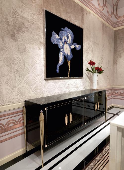 140x140cm Sanatsal cam, Swarovski kristalleri, sedef ekleri olan pleksiglas taban. Paslanmaz çelik çerçeve.