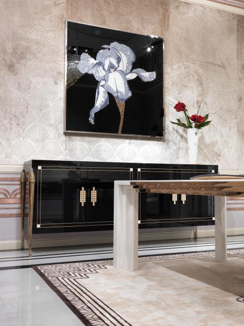 Açıklama: 140x140cm Sanatsal cam, Swarovski kristalleri, sedef ekleri olan pleksiglas taban. Paslanmaz çelik çerçeve.