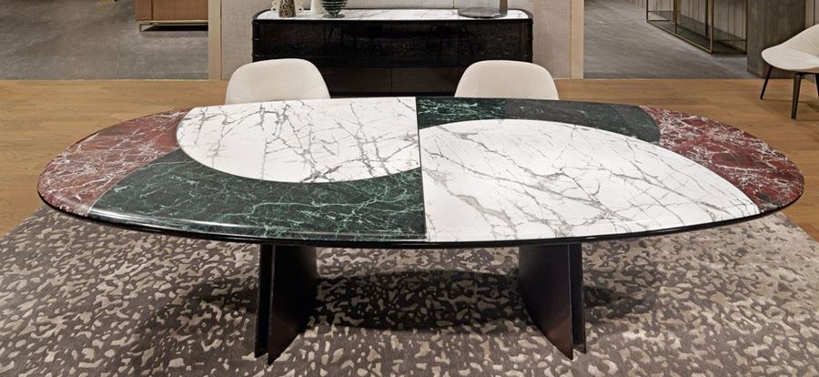 Mermer tipli oval yemek masası, paslanmaz çelikten 5 mm metal profilli üç tip mermer işlemeli makro mozaikten oluşuyor. Üstün kenarı yuvarlak bir kenarla işlenmiştir. Yuvarlak kesitli, parlak lake ahşaptan alt taban. Siyah deri ile kaplanmış, dekoratif profilleri paslanmaz çelikten yapılmış içbükey ahşap ayaklardan yapılmış taban. Yuvarlak modelde, üç içbükey bacağı, üst kısmı “”Lazy Susan”” döndürülerek çıkarılabilir veya çıkarılabilir şekilde çıkarılabilir. Tabanın metal kısımları metal kaplama seçiminde mevcuttur.