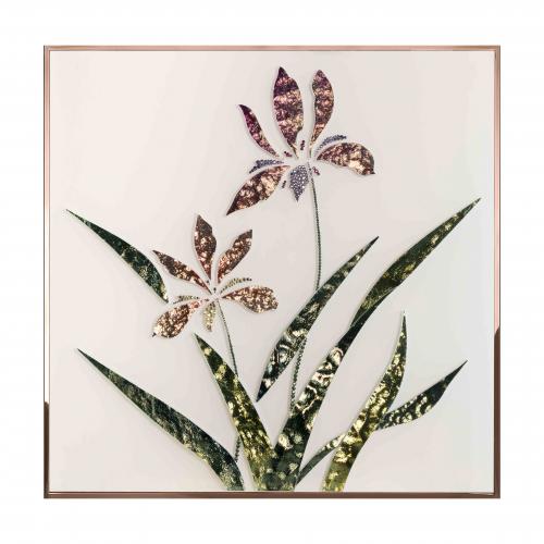 Açıklama: 70x70cm Sanatsal Murano cam parçaları ve Swarovski kristalleri ile sedef pleksiglas taban. Çelik çerçeve, çeşitli metal yüzeylerde mevcuttur.
