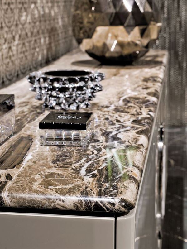 MD’de 4 kapılı, üstü mermerden, pantografla bükülmüş kenarları olan kaide altından alçak kabin. Parlak fırçalanmış polyester vernikte dış kaplama. Mat cilalamada iç kaplama. El yapımı ve kabartmalı Visionnaire logolu ahşap, sanatsal seramik karo ile işleyin.