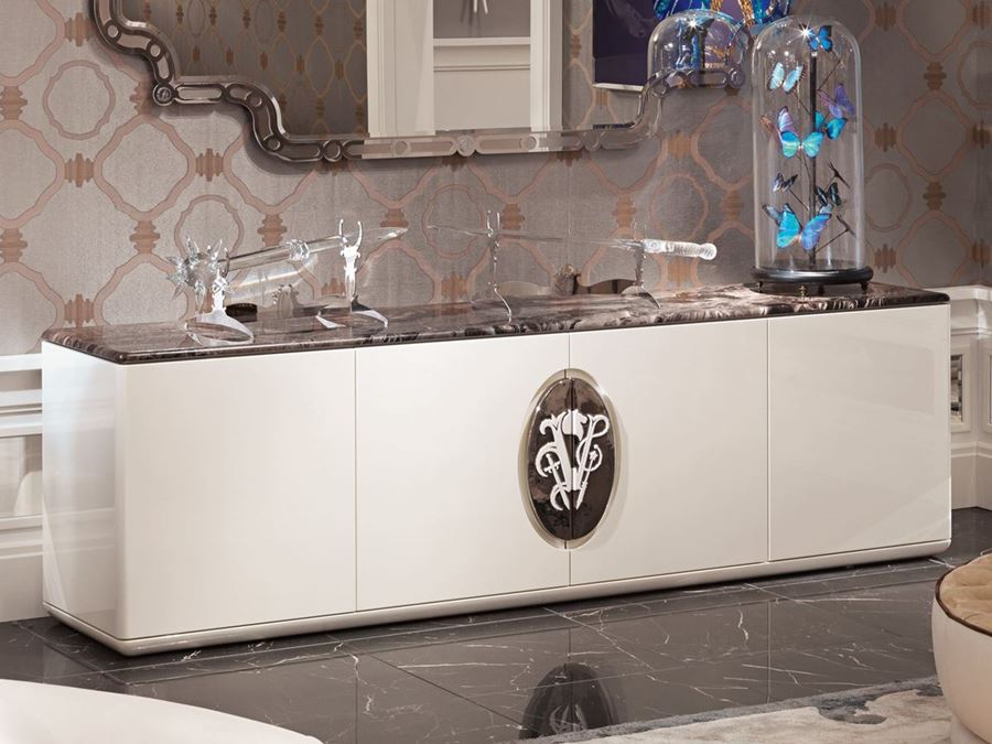 MD üzeri 4 kapılı, üstü mermerden, pantografla bükülmüş kenarları olan kaide ile yüksek kabin. 5 raf ile donatılmıştır. Parlak fırçalanmış polyester vernikte dış kaplama. Mat cilalamada iç kaplama. El yapımı ve kabartmalı Visionnaire logolu ahşap, sanatsal seramik karo ile işleyin.