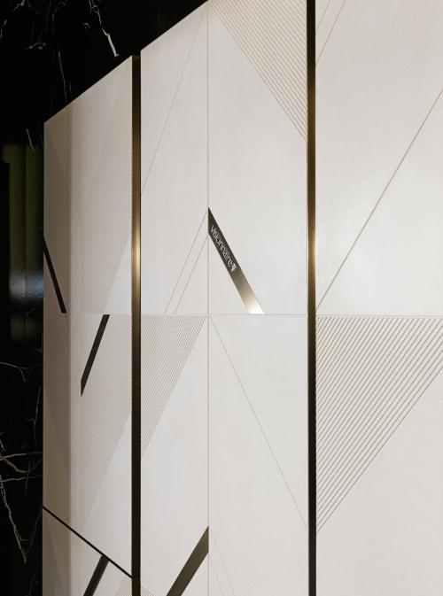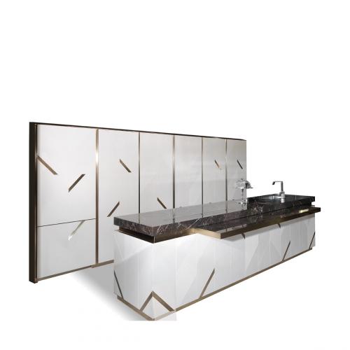 6 sütundan oluşan modüler bir yapı elemanı. Ana yapı, yüksek dayanıklı melamin kaplı ahşap partiküllerden yapılmış, 19 mm genişliğinde, aynı malzemeden yapılmış sırt dayanağı, 10 mm genişliğinde, renk olarak kremdir. İç raflar, 10 mm genişliğinde satine edilmiş güvenlik camından yapılmıştır. Dikey profil şeritleri satine edilmiş paslanmaz çeliktir. Depolama ünitesi, yavaşlatılmış menteşelerle donatılmış salıncak kapılarla birlikte gelir. Fırınlı üniteler, kayar kapılıdır. İç LED ışık sistemi bulunur. Kapılar, kabartmalı süslemelerle tamamlanmış doğal taşlar ve satine edilmiş paslanmaz çelik eklem ile birlikte gelir, 2 mm genişliğinde 25 mm satine edilmiş paslanmaz çelik profillere sahiptir, yan paneller MDF mat boyalıdır. 65 mm deniz kontrplaktan oluşan zemin, satine edilmiş paslanmaz çelikle kaplanmıştır. Metal süslemeler krom, altın, şampanya, bronz, Siena, siyah nikel ve gunmetal bitişlerinde mevcuttur. Bu kompozisyon, aksesuarlar ve cihazlar için uygundur: Mastercool buzdolabı, kahve makinesi, bardak saklama çekmecesi, vakum makinesi, mikrodalga fırın, buharlı fırın, çok fonksiyonlu fırın.