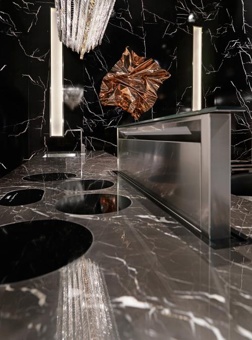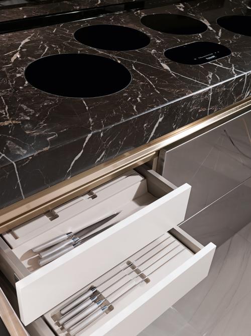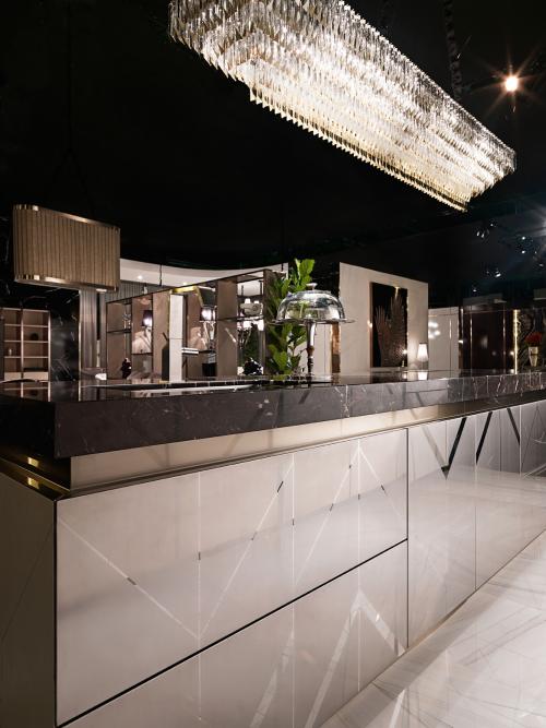 Atıştırmalık masa olan bir ada. İtalyanca “struttura in particelle di legno nobilitate in melamminico ad alta resistenza sp. 19 mm con schienali nello stesso materiale sp. 10 mm, colore avorio” ifadesi, dayanıklı melamin kaplı yüksek yoğunluklu ahşap partiküllerden yapılmış 19 mm kalınlığında bir yapı ve aynı malzemeden yapılmış 10 mm kalınlığında sırtlar, krem rengi. İç raflar, 10 mm kalınlığında satine edilmiş güvenlik camından yapılmıştır. Yatay profil şeritleri, satine edilmiş paslanmaz çeliktendir. 120 cm’lik sepetli tabanlar, üst kısımda tutma sapı bulunan ve alt kısımda itme-çekme servo yardımcılığıyla çalışan sepetler, çekmeceler, yüksek dayanımlı melamin kaplı ahşap partikül tabanlı, metalik gri renkte alt kısımlı, boyalı çelik yan paneller ve camlarla birlikte. Tam açılabilen çekmece kılavuzları, yavaşlatılmış kapanma özelliğiyle 80 kg taşıma kapasitesine sahiptir. Yan ve arka paneller, kabartmalı süsleme ile işlenmiş doğal taştan ve satine edilmiş paslanmaz çelik dekoratif eklemlerle birlikte, 2 mm kalınlığında 25 mm paslanmaz çelik kenarla birleştirilmiştir. 65 mm kalınlığında deniz kontrplaktan oluşan taban, satine edilmiş paslanmaz çelikle kaplanmıştır. Dahil edilen aksesuarlar: LED aydınlatma, tezgâha saklanabilen aspiratör, çatal-kaşık takımı, geri dönüşüm sistemli çöp kutusu, bıçaklık, ayarlanabilir ağızlı satine edilmiş paslanmaz çelik musluk, altta monteli paslanmaz çelik lavabo. 10 cm genişliğinde uygulanmış olan Noir Saint Laurent cilalı mermer tezgâh. Bağımsız indüksiyon ocakları için hazırlık. Metal süslemeler krom, altın, şampanya, bronz, siena, siyah nikel, kahverengi bronzda mevcuttur.