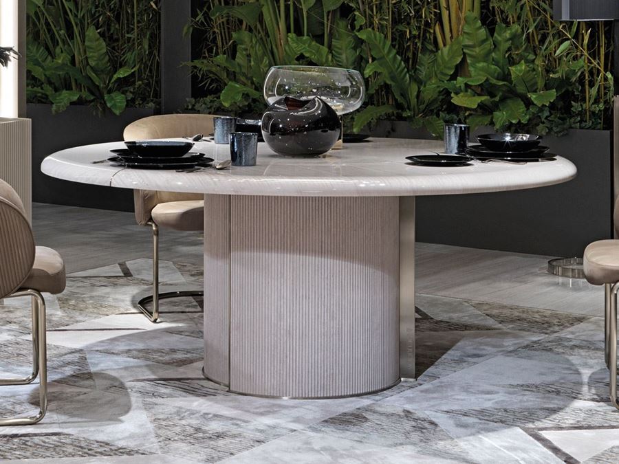 Açıklama: Veneeer veya lake üst ve tabanın yapısı, kandil dekorasyonu ile basamaklı taban, dekoratif profiller ve oyulmuş Visionnaire logolu saten paslanmaz çelik taban. Boyalı alüminyumun altında. Üst kenarda 3 metal frizle süslenmiş ve üstte yerleşik “Lazy Susan” ı çevirerek çıkarılabilir. Kaplama seçim kaplamalarında bulunan ahşap parçalar; metal kaplamalar, saten metal kaplama seçiminde mevcuttur.