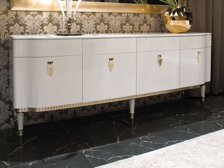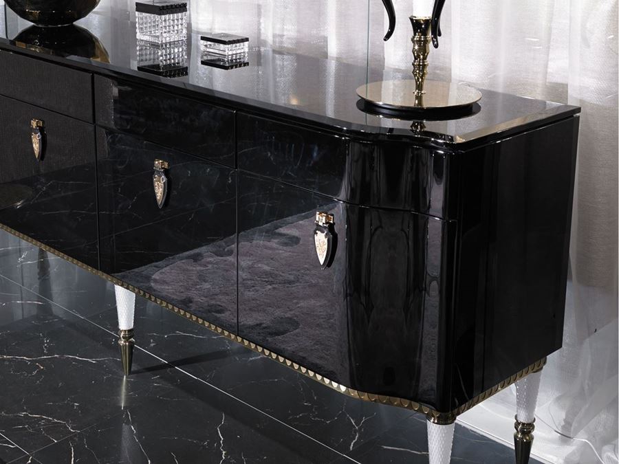 Açıklama: MDF ve kontrplaktan yapılı ve üst kısmı 4 kapılı, 4 itmeli çekmeceli, parlak fırçalanmış polyester lake kabine. Deri ekli kalkan tutacağı ve altın rengi pirinçten Visionnaire arması. MDF'de 2 raflı paspas iç parçaları. Visionnaire oval süslemeli çelik laminatta alt bant, parlak altın vernikli. Pırıltılı ve taşlanmış kristalde, elmas desenli ve buzlu kaplamalı, koni biçimli elemandan yapılmış ayaklar. Alüminyum ve parlak altın lake pirinçten talaş ve detaylar.